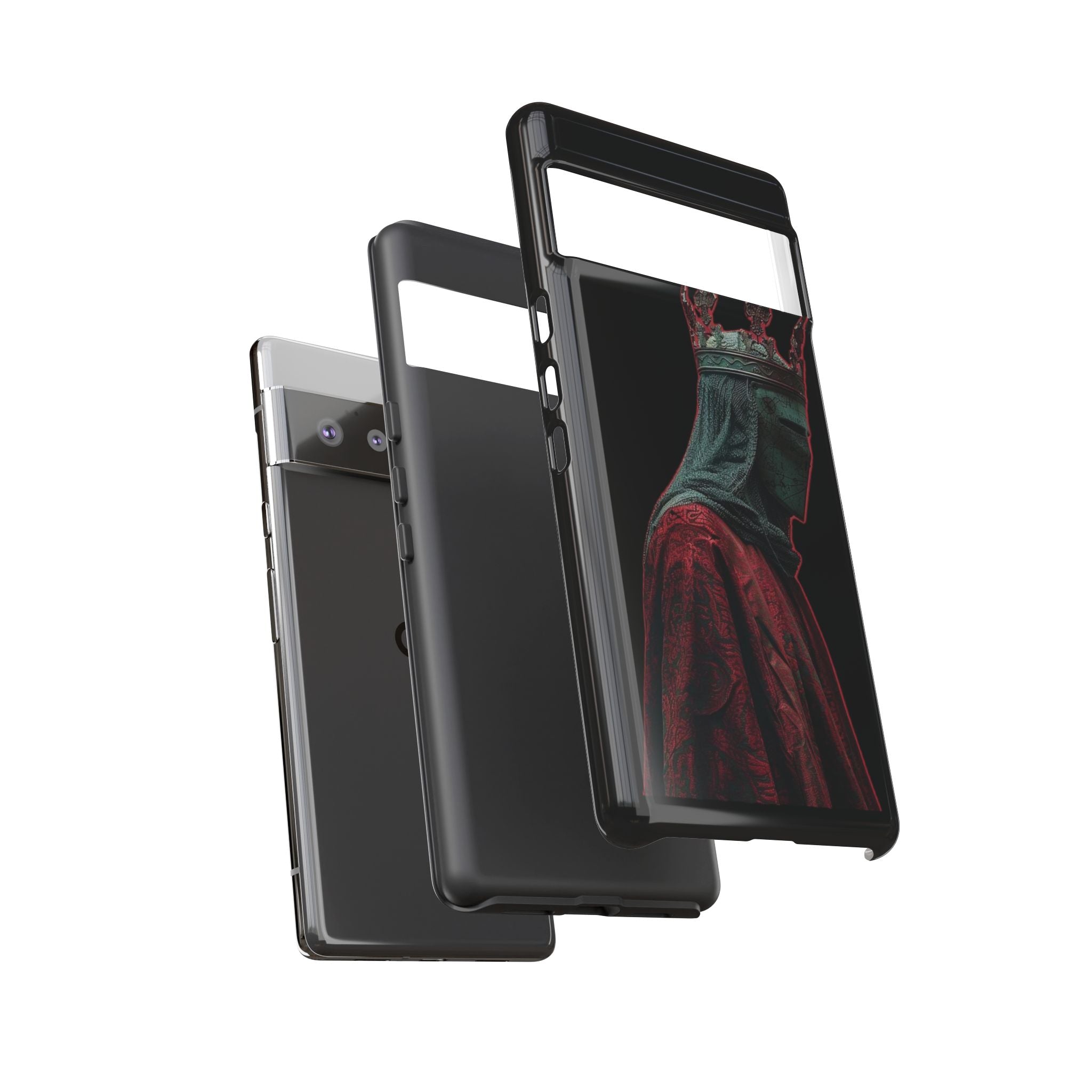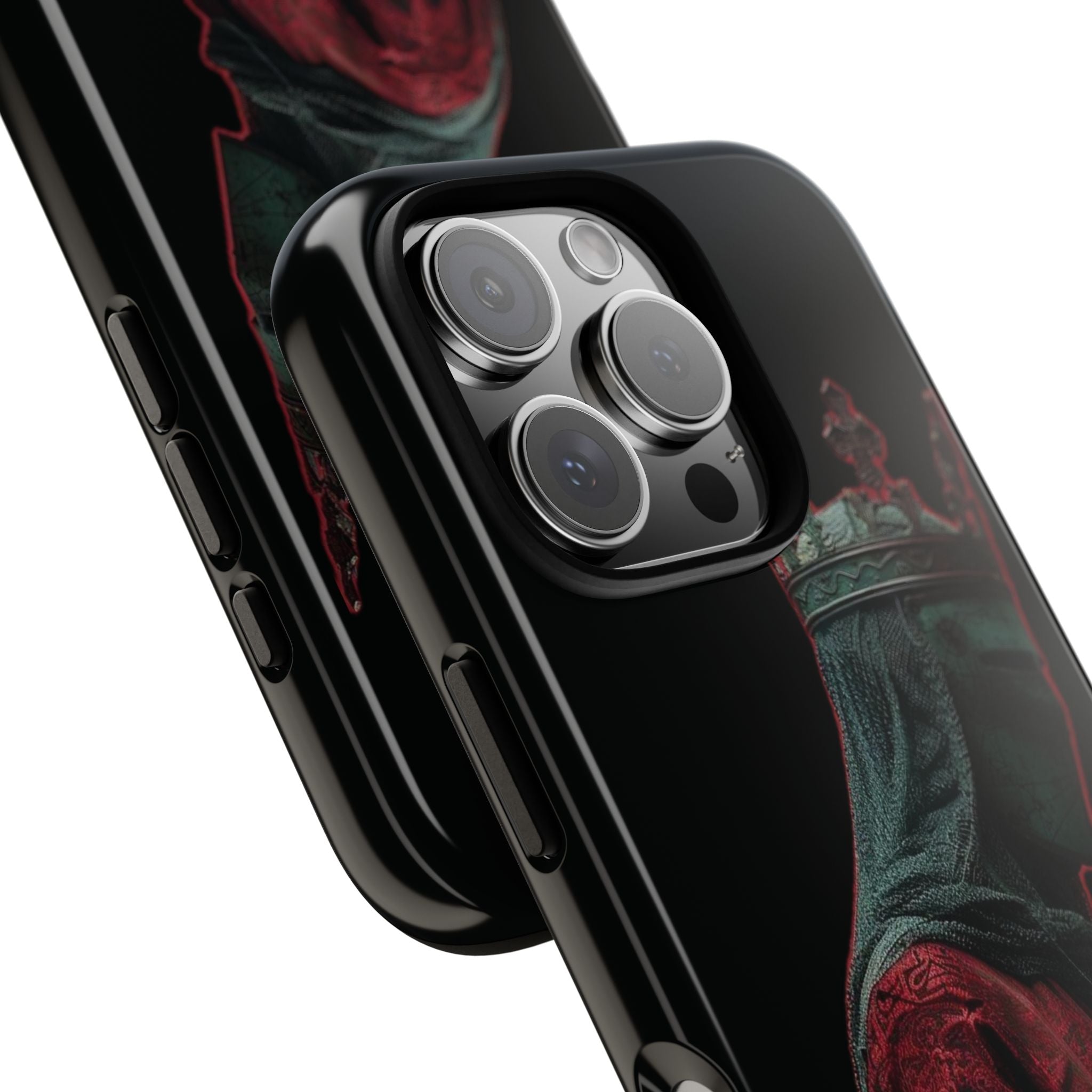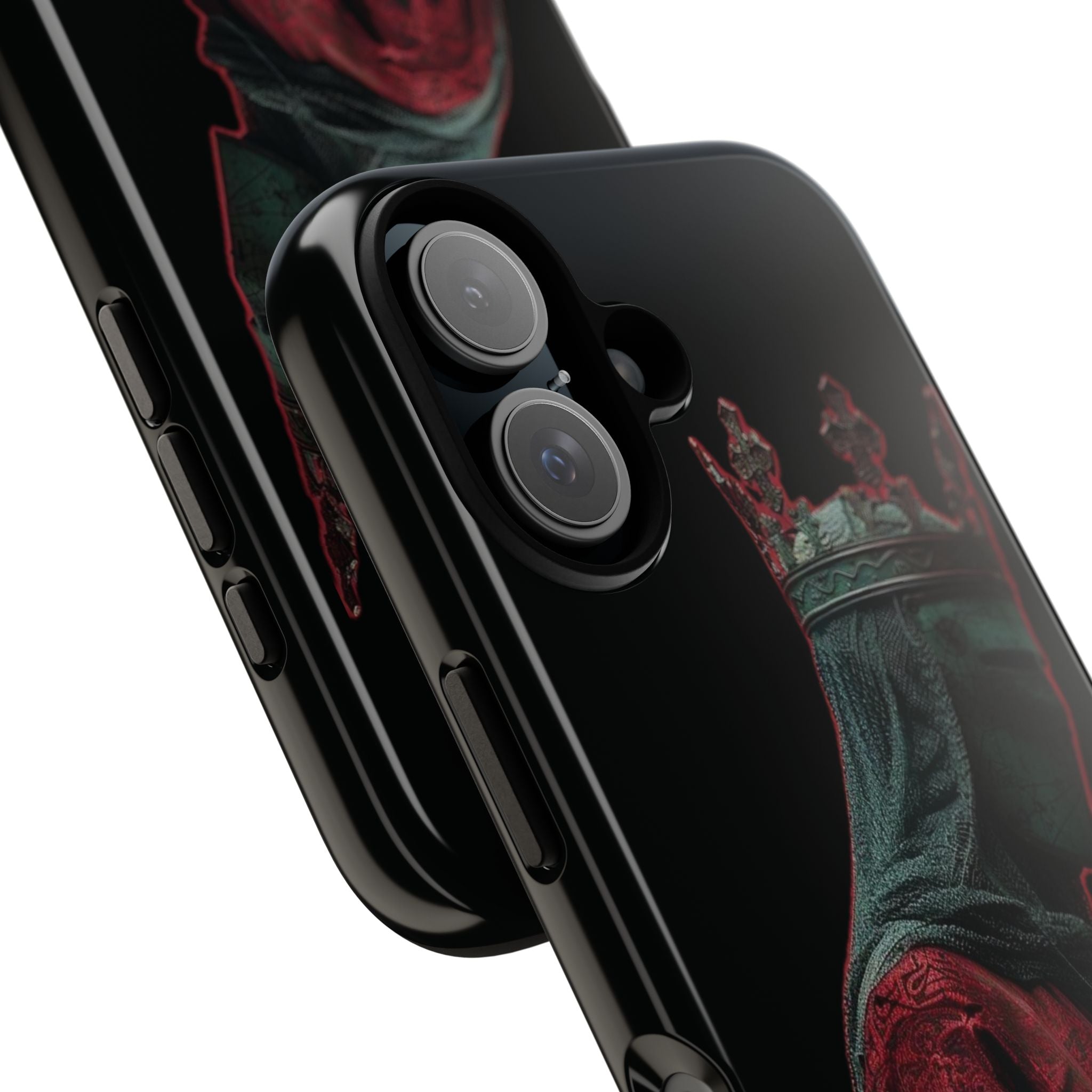 This slim, dual-layer phone case brings a dark, regal mood to your everyday carry. The full-wrap 3D print renders a medieval crowned figure in deep reds against a matte black field, giving the case a low-profile, artful presence. Built from a rigid polycarbonate shell and soft TPU silicone liner, it absorbs shocks and resists drops while keeping ports clear and wireless charging available. UV-protected inks preserve contrast outdoors, and the glossy or matte finish options let you choose the look that fits your style. Made to handle daily wear with certified safety standards and crafted for recent phone models, it transforms a functional necessity into a statement piece for those who favor moody, historical aesthetics.